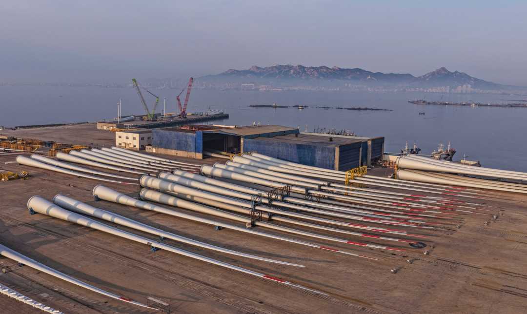4月1日,在山东省荣成市石岛管理区海上风电产业基地,超大型风电叶片排列整齐,等待吊装、运输至海上作业区进行安装。