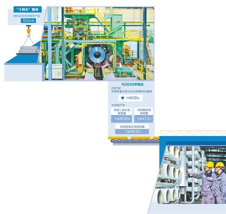绿色发展是高质量发展的底色。近年来,钢铁行业深入推进超低排放改造工程和钢铁极致能效标杆示范三年行动,环境治理成效显著。与2020年相比,2025年,中钢协重点统计企业吨钢可比能耗下降0.8%;外排废气中,吨钢二氧化硫、吨钢颗粒物、吨钢氮氧化物排放量分别下降40.8%、41.3%、46.8%。