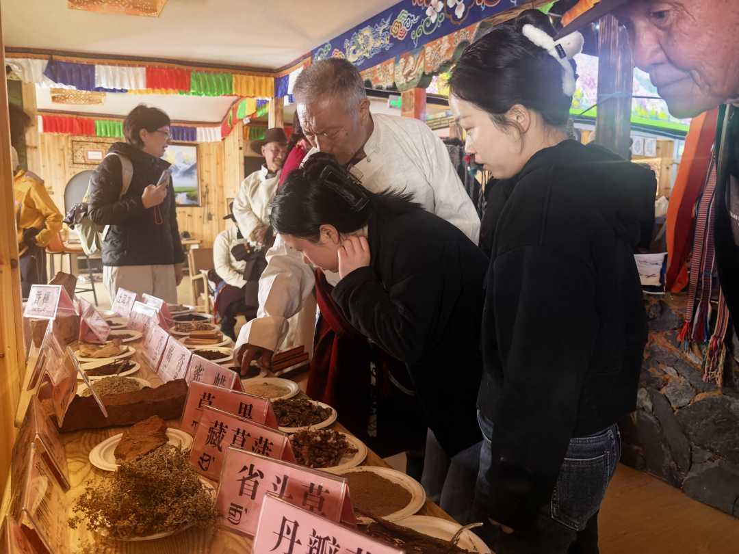 藏香制作技艺传承人为游客介绍藏香原料。贺建明摄
