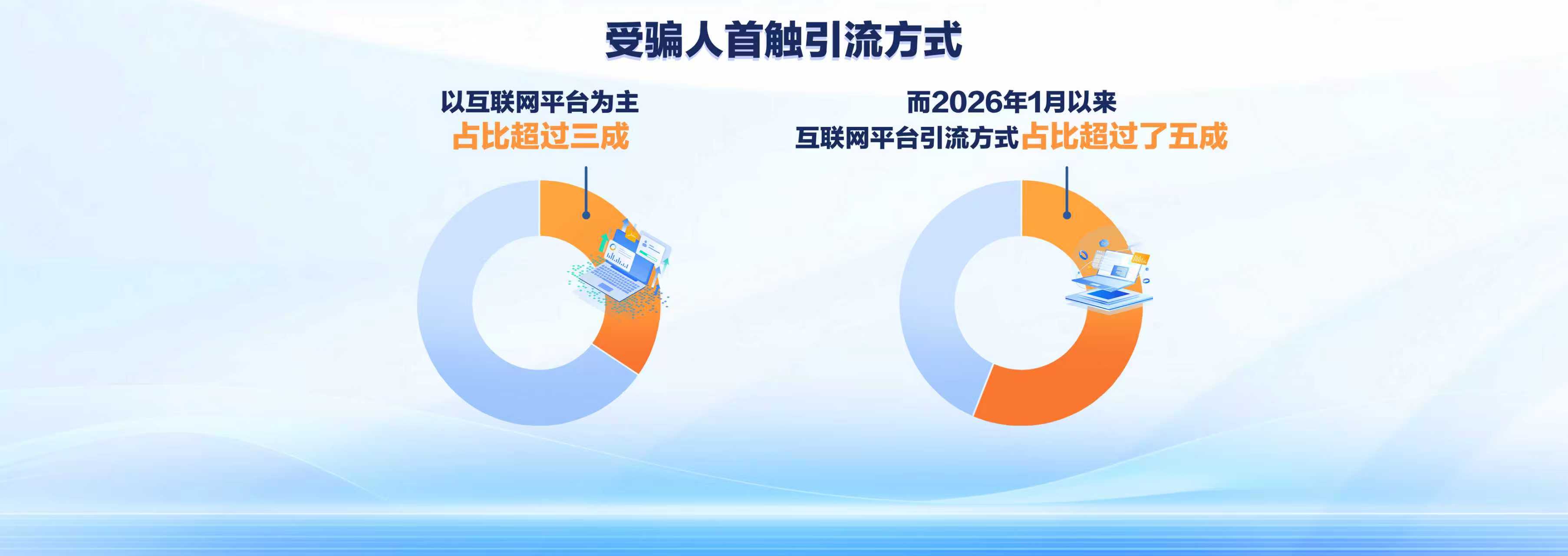 此外,冒充电商物流客服、冒充领导熟人、贷款代办信用卡等骗局也较为多发。虚假征信类诈骗占比仅0.19%,同比大幅下降57.46%,表明此类诈骗的打击治理与宣传防范成效显著。当前,电诈引流渠道更加隐蔽,互联网平台成为首要引流入口,占比已超五成,社交软件、短视频、APP广告是主要触达方式。大额案件中,虚假刷单返利与投资理财类占比达73.8%,骗子多通过主流社交软件搭线,再诱导受害人转移至小众APP沟通。