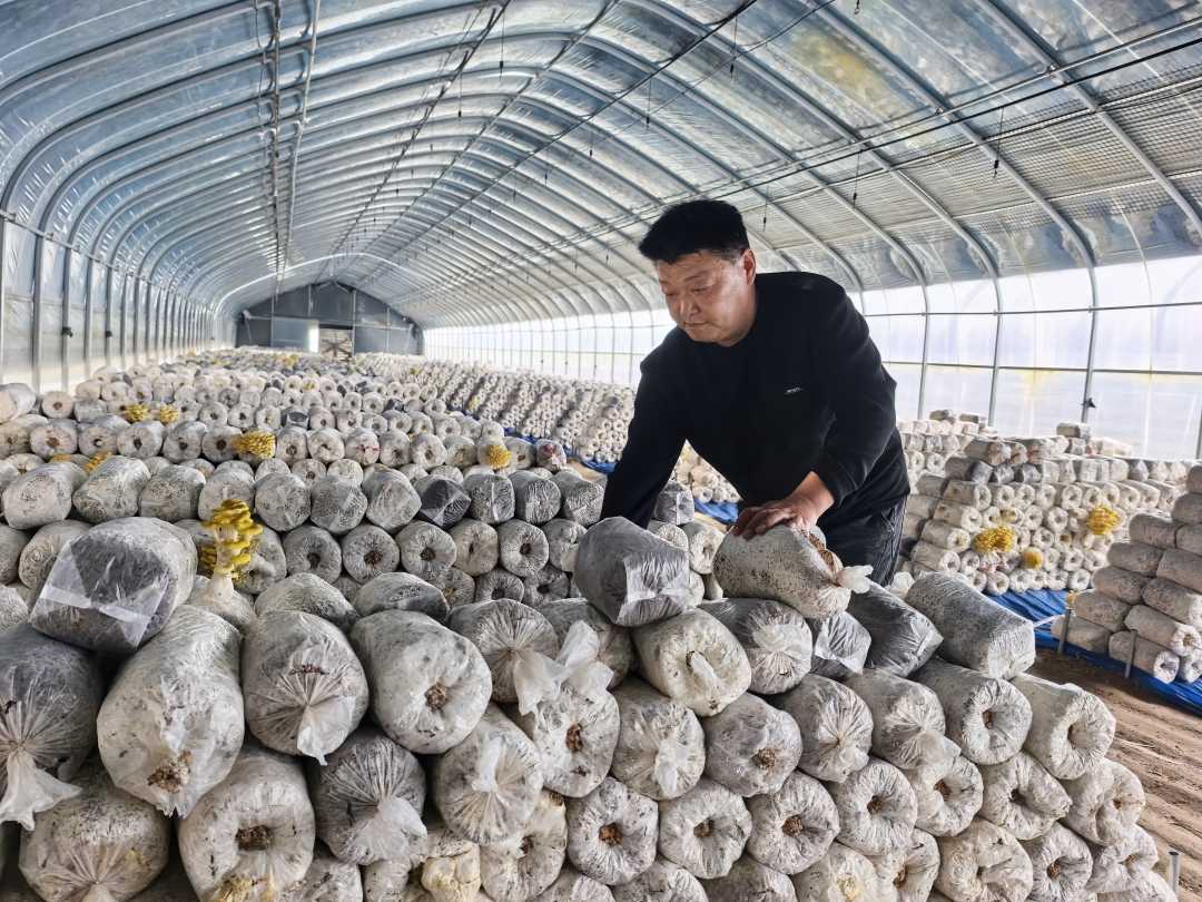 图为封丘县隆诚专业种植合作社负责人李正利正在大棚内整理榆黄菇菇棒。杨恒战 摄