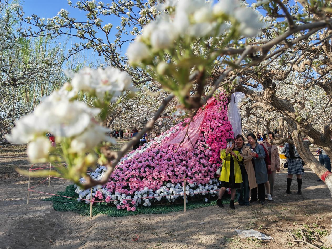 开幕的会场,搭在梨园中的花瀑布以梨花为形,从高处倾泻而下,花样秋千轻轻摇晃,百花墙上红、粉、黄与梨花白交相辉映……多个网红打卡点环环相扣。舞台上,文旅推介官授牌、星级农家乐奖补资金发放、县市旅游推介等环节依次进行,精彩文艺表演赢得阵阵掌声。舞台周边同样热闹:非遗集市内,剪纸、刺绣、香梨木雕等技艺匠人现场展示,梨花市集前,香梨膏、梨花糕、梨花茶等衍生产品排起长队,传统服饰及民族服饰巡游队伍穿行其间。