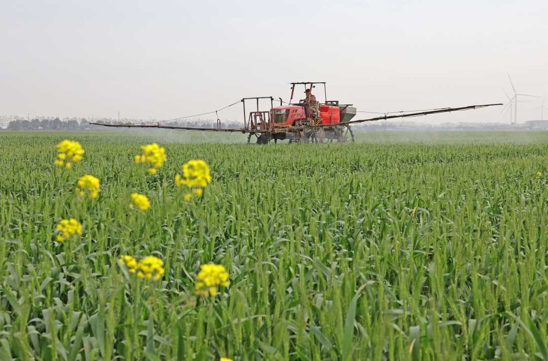 4月6日,安徽省安庆市宿松县省属农垦华阳河农场,农机手驾驶植保机开展“一喷三防”作业,确保夏粮增产丰收。