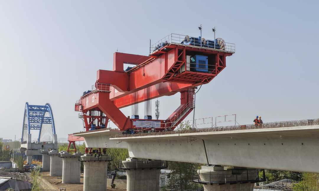 4月5日拍摄的山东济枣高铁枣庄段工程建设现场。清明假日,建设者坚守一线,抢抓工期,利用架桥机等大型机械设备进行箱梁架设作业。
