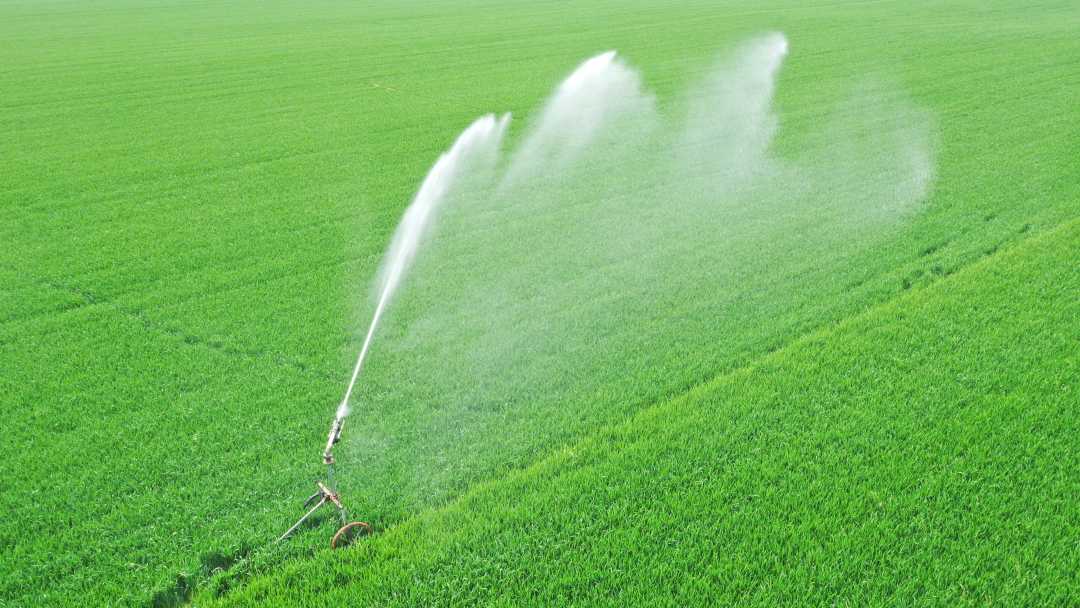 4月6日,河南省许昌市建安区陈曹乡一处麦地,农民利用喷灌设施为小麦进行浇水作业。