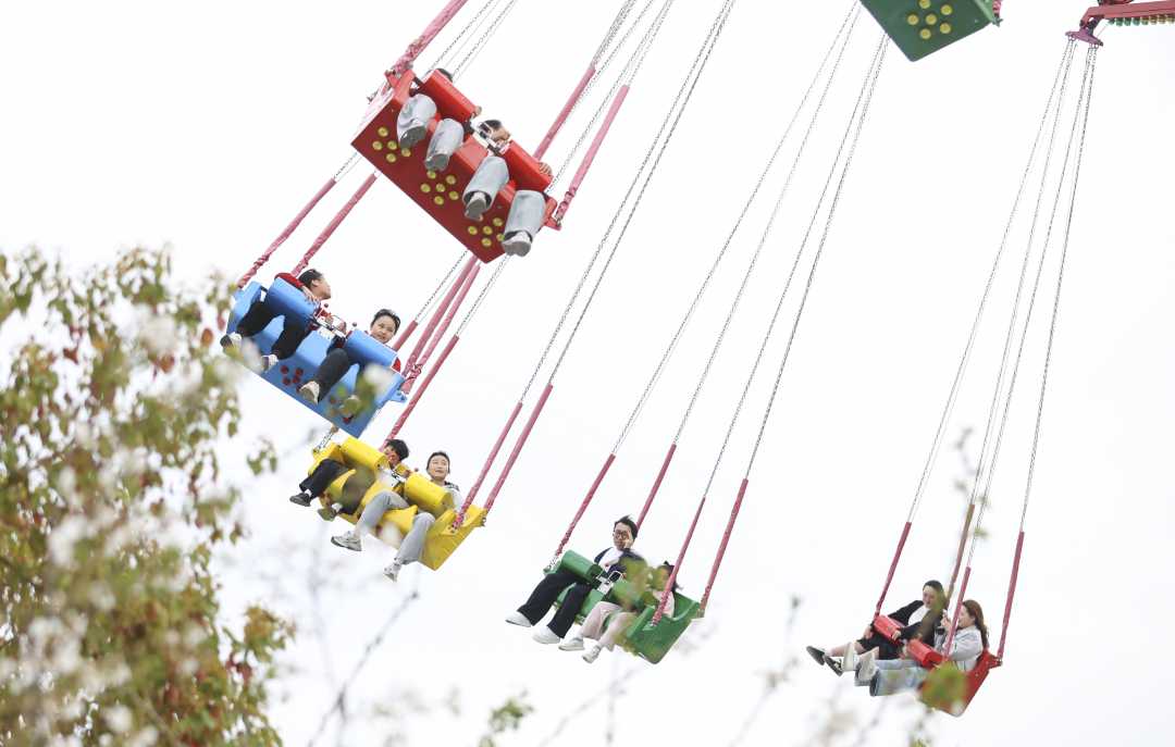 4月6日,江苏省淮安市樱花园内,游客在体验娱乐项目,乐享假期。