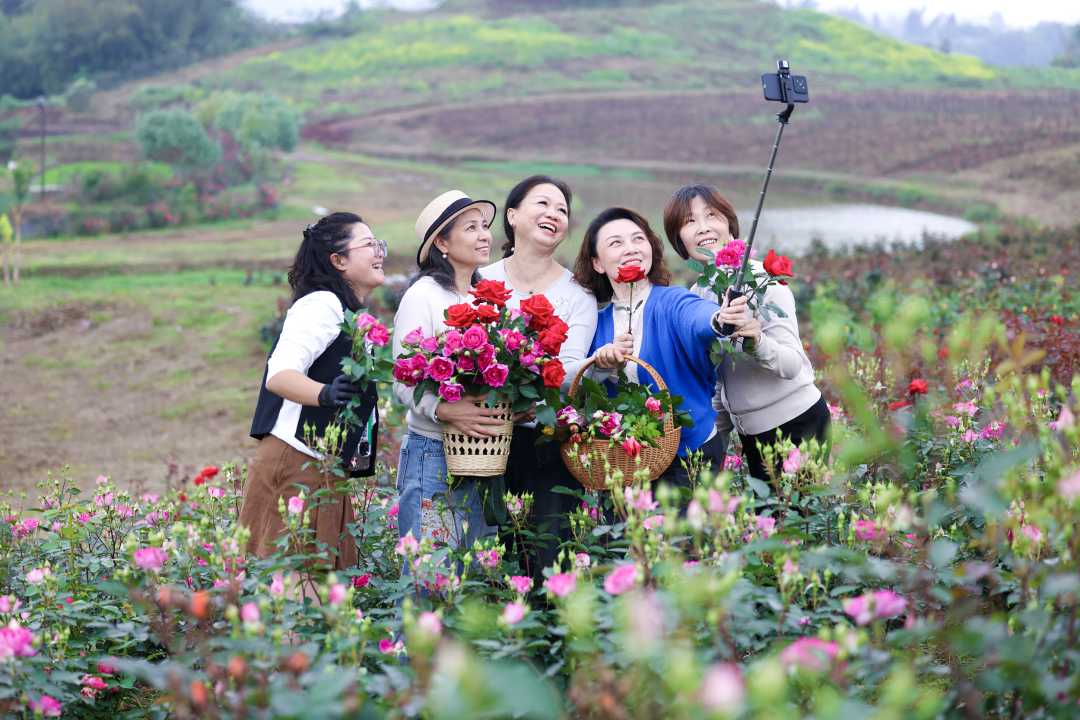 4月6日,游客在四川省泸州市合江县白沙镇忠孝佛手园采摘鲜花、打卡拍照。