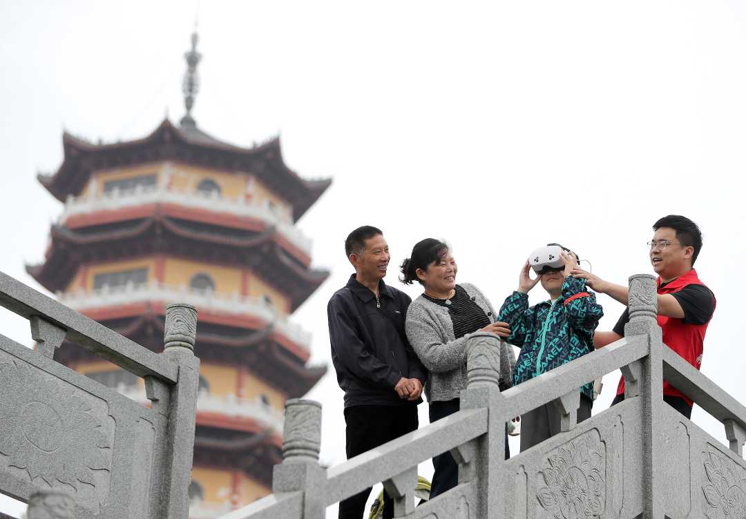 4月6日,湖北省荆门市沙洋县纪山镇纪山寺,荆门市博物馆开展“流动博物馆”进景区活动,游客戴上VR眼镜,瞬间“穿越”至战国楚地,体验观看楚简制作过程。