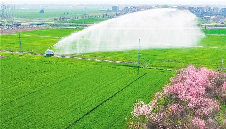 3月27日,河南省商丘市睢县城关镇袁庄村麦田,智能灌溉机器人在进行水肥一体化喷灌作业。徐泽源摄(中经视觉)