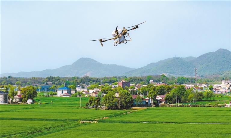 4月5日,植保无人机在安徽省芜湖市平铺镇小麦田进行春管作业。 刘伯顺摄(中经视觉)