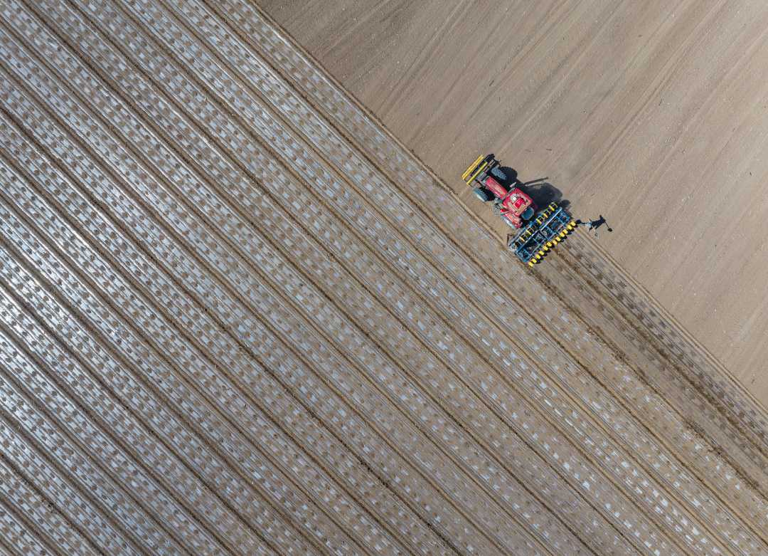 4月8日,新疆昌吉回族自治州昌吉市大西渠镇思源村,农户在用北斗卫星导航无人驾驶拖拉机播种棉花。天气回暖,昌吉市43万亩棉花全面开播。