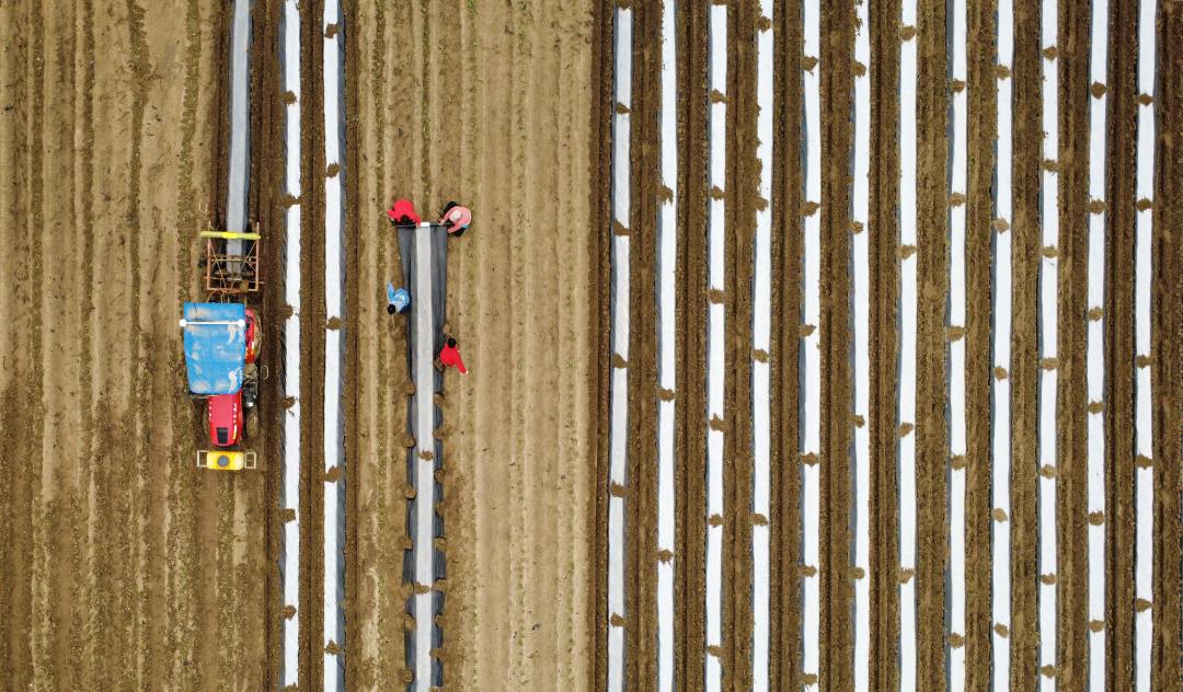 4月9日,河北省石家庄新乐市正莫镇岸城村,农民驾驶着农机给红薯秧苗覆膜。时下,各地农民抢抓农时开展春季农业生产,田间地头一派农忙景象。