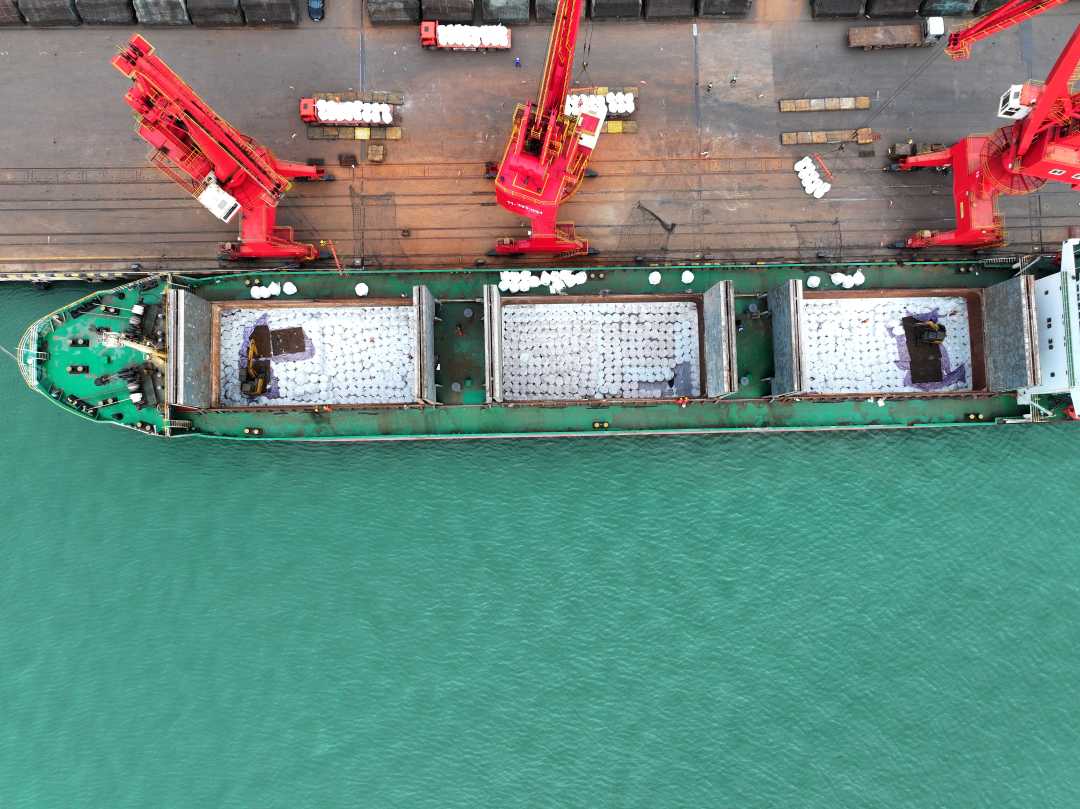 4月8日,货轮在江苏省连云港港口码头卸运春耕化肥。近日,连云港港加大化肥运输力度,实行快卸快运,为春耕生产和粮食安全提供高效有力的运输支撑。