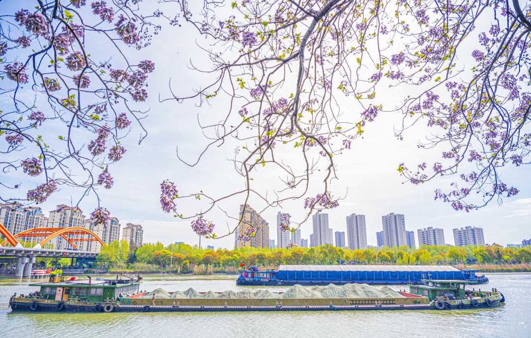 4月8日,在江苏省宿迁市宿城区项里街道大运河畔,泡桐花竞相开放,货运船只穿梭往来,犹如行驶在画中。
