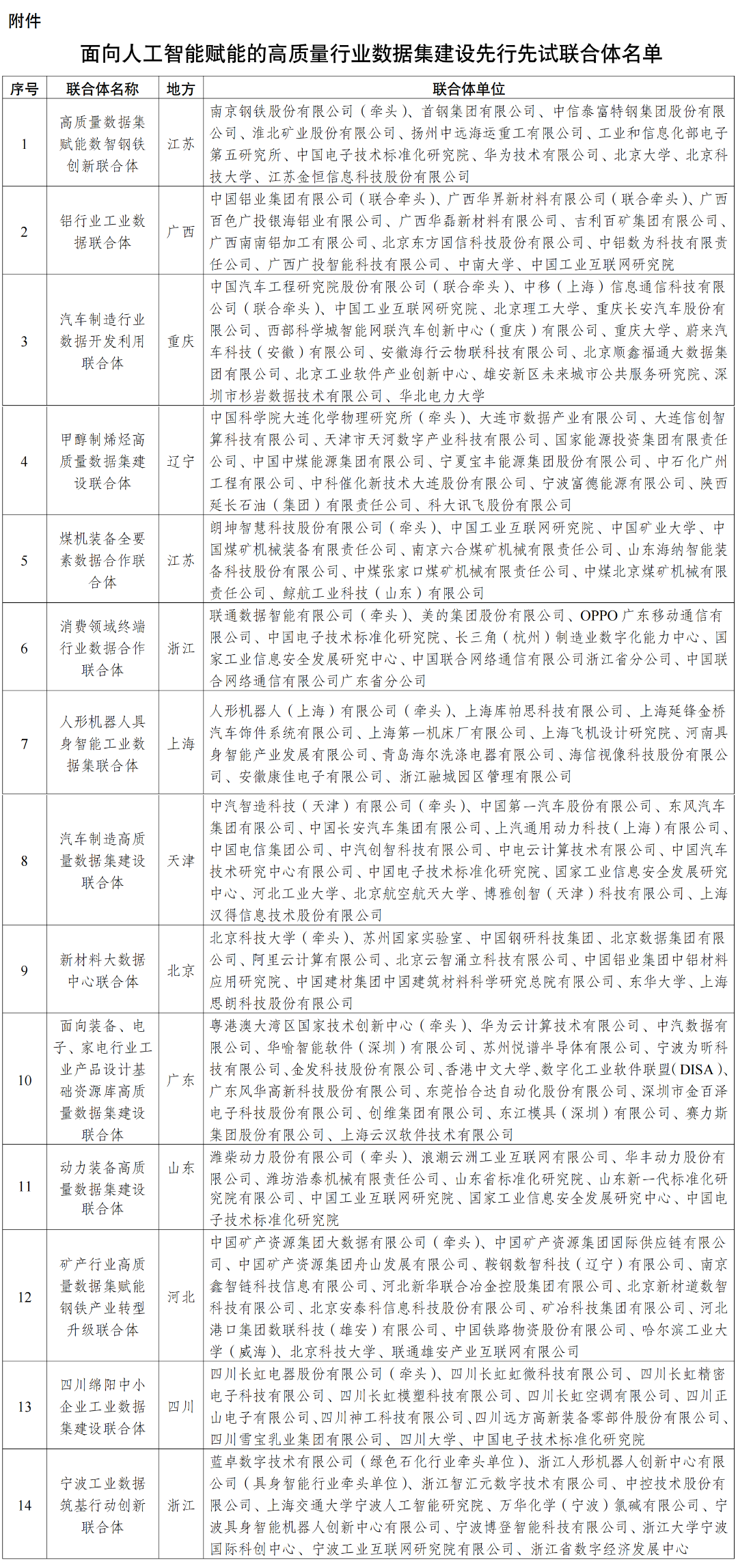 近日,工业和信息化部公布面向人工智能赋能的高质量行业数据集建设先行先试联合体名单,共14个联合体上榜。