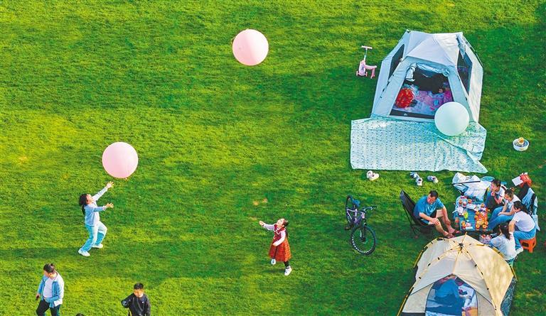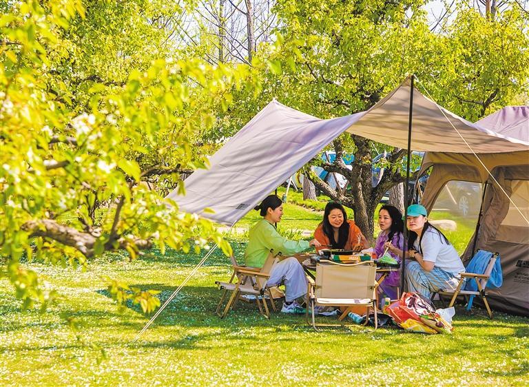 4月4日,市民在湖北省黄石市黄石奥体公园休闲露营,享受春日美好时光。周 巍摄(中经视觉)