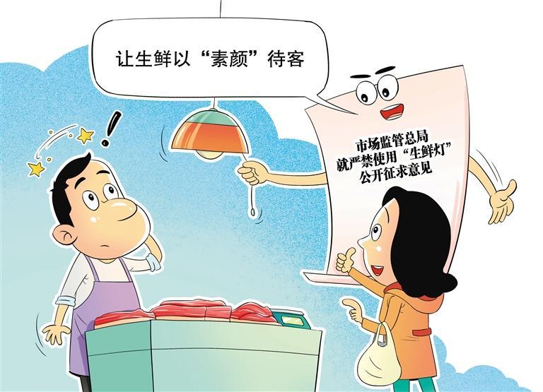 近期,市场监管总局监测发现,仍有部分市场销售者使用美化肉菜瓜果等生鲜食用农产品感官性状的照明等设施,欺骗误导消费者,扰乱市场秩序,就此起草了《市场监管总局关于严禁使用“生鲜灯”的公告(征求意见稿)》。征求意见稿明确,食用农产品销售者经营、展示等场所使用的照明设施色表特征应为白光等不会影响消费者对食用农产品真实感官性状认知的光源。消费者享有知悉其购买、使用的商品或者接受的服务真实情况的权利,销售者应避免欺骗误导消费者。食用农产品集中交易市场开办者要依法依规履行主体责任,对入场食用农产品销售者使用生鲜照明设施情况进行常态化管理。