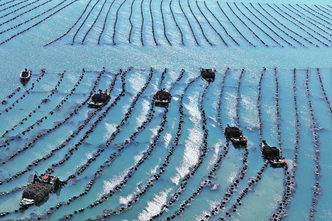 4月12日,山东省荣成市俚岛镇俚岛湾牡蛎养殖区,渔民驾船收获牡蛎。