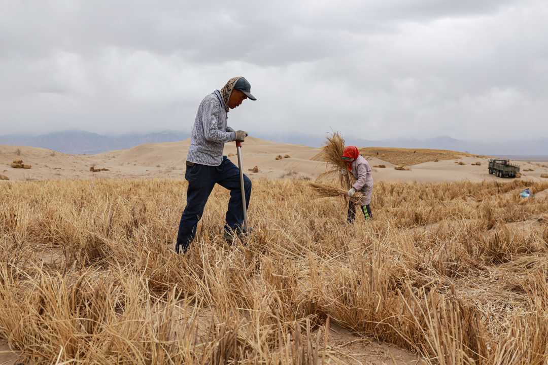 4月12日,甘肃省酒泉市清水镇单墩子滩风沙治理区的连绵起伏的沙丘上,治沙工人用稻草扎设草方格沙障。