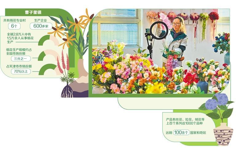 不产花苗,没有种子,更不用园丁,却能让缤纷花朵跨越四季,经久绽放——作为全国绢花产业的重镇,天津市武清区曹子里镇目前绢花生产规模约占全国市场份额的三分之一,占天津市市场份额的70%以上,年产值近12亿元。当地产品有丝花、拉花、绒花等上百个系列近1000个品种,远销100余个国家和地区,是名副其实的“中国绢花之乡”。近日,记者深入探访这座“绢花小镇”,解码其从传统手工业到现代产业集群的蝶变之路。