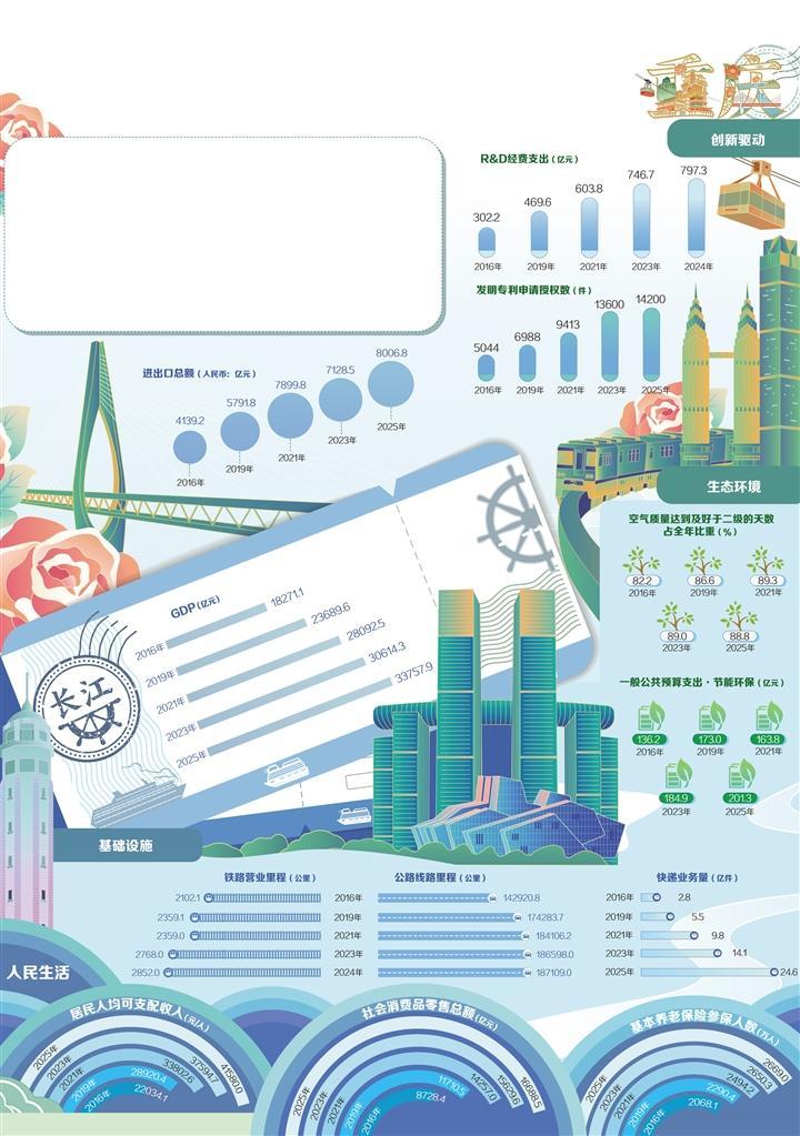 产业绿色转型迈出新步伐。重庆构建以智能网联新能源汽车、新一代电子信息制造、先进材料为主导的“33618”现代制造业集群体系,以数字化、绿色化推动产业向中高端迈进。截至2025年,重庆累计创建国家级绿色园区16个、绿色工厂170家,绿色生产方式为市民带来更清洁的生活环境。