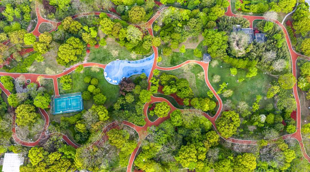 4月16日,空中俯拍江苏省宿迁市泗洪县古徐广场,彩色园路、智慧休闲健身设施配套完善。