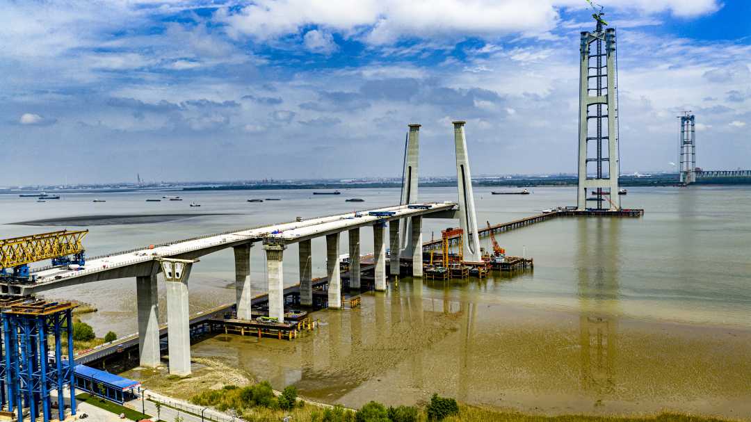 4月18日,江苏省张家港市,张靖皋长江大桥建设现场热火朝天,建设者有序施工作业。张靖皋长江大桥是国家“十四五”重点过江通道项目,贯通苏州张家港、泰州靖江和南通如皋,全长29.85公里,预计2028年基本建成。