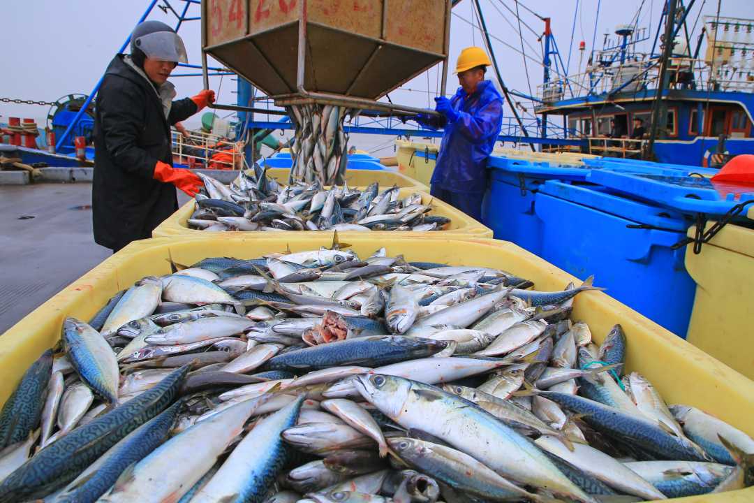 4月18日,浙江省玉环市大麦屿渔港码头,渔民们忙着卸载渔获。近段时间,当地渔民抢抓渔业生产,及时将新鲜渔获转运上岸,投放市场。