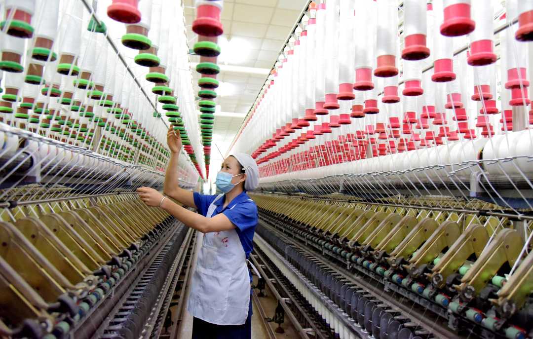 4月17日,江苏省睢宁县美丰纺织(徐州)有限公司,工人正在车间忙碌,抢抓生产完成出口订单。