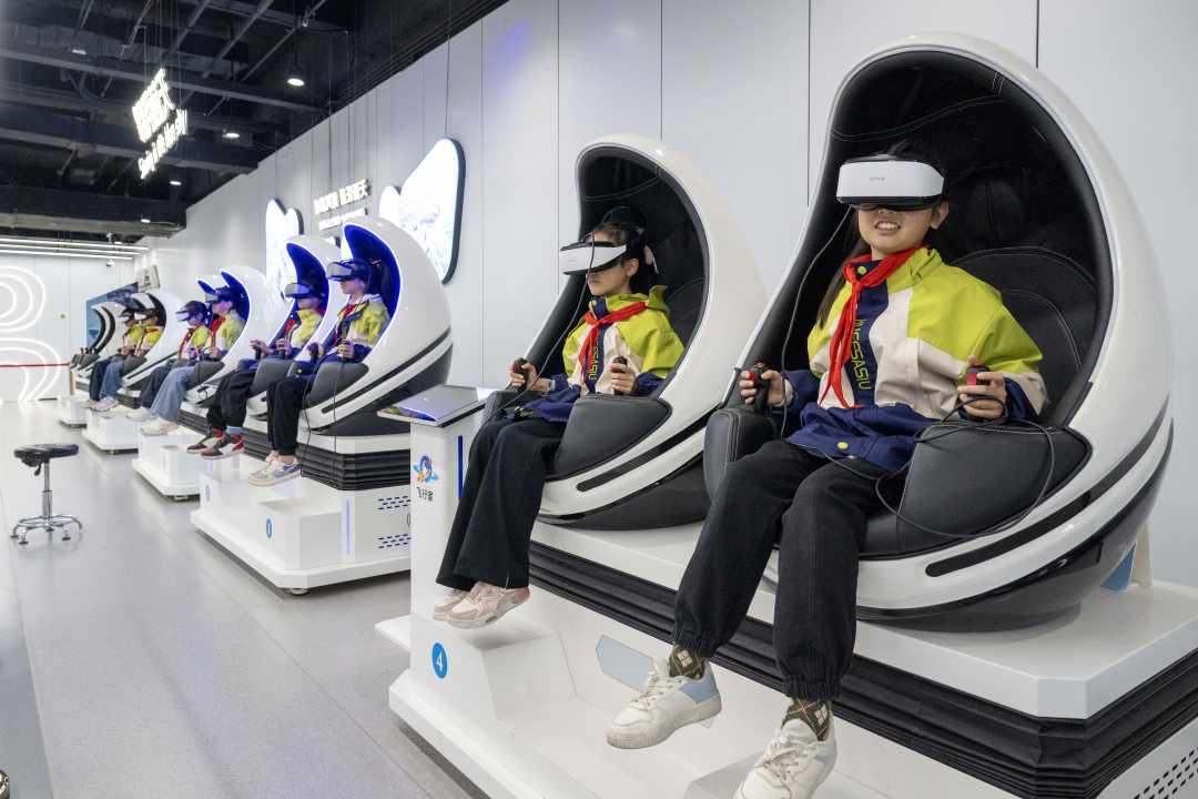 4月22日,安徽省合肥市南门小学学生在合肥市航空科普馆体验航天项目。4月24日是第11个“中国航天日”,也是中国航天事业创建70周年,多地科技馆举办了系列开放参观与科普活动。