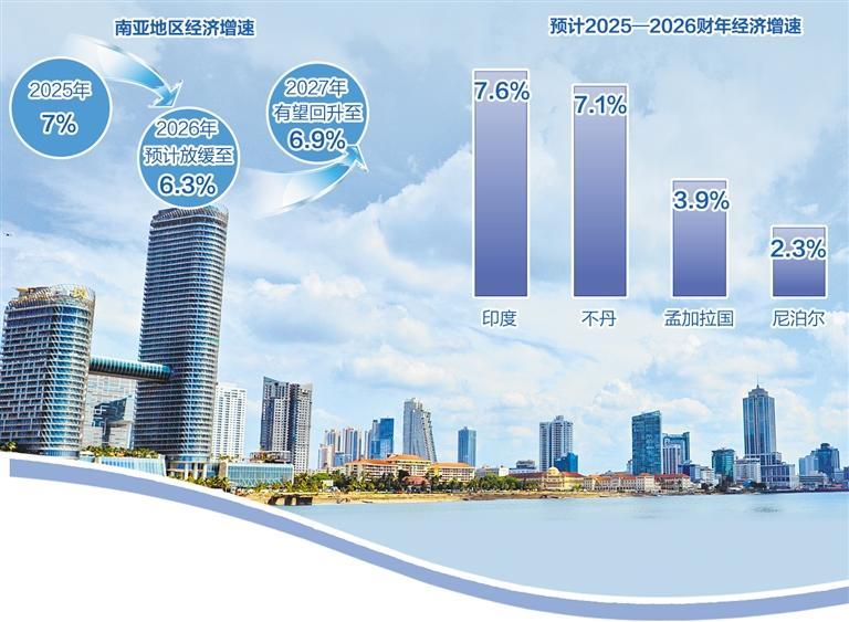 世界银行近日发布的《南亚地区经济展望》报告指出,受中东冲突和全球能源市场动荡影响,南亚地区2026年经济增速预计将从2025年的7%放缓至6.3%,2027年有望回升至6.9%。尽管增速有所放缓,但南亚仍是全球经济增速最快的地区之一。总体来看,南亚地区国家推行产业政策力度很大,但效果参差不齐,经济增长前景还存在很大不确定性。