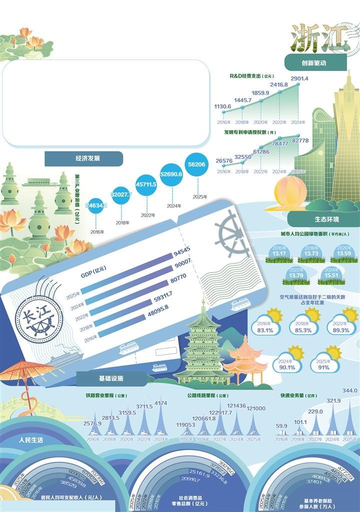 聚焦协同融通,浙江构建服务支撑体系新发展格局。在综合立体交通建设方面,沪苏湖高铁、苏台高速等一批重大项目建成通车,沪杭高铁、温福高铁浙江段开工建设,高标准建设舟山江海联运服务中心,成功开辟江海直达航线14条,覆盖川渝、湖北、湖南、安徽、江西等地。在对外开放能级建设方面,宁波舟山港货物吞吐量连续17年居全球第一位,承担了长江经济带90%以上的油品中转量、50%以上的铁矿石中转量。浙江中欧班列发运量也位列全国前列,已构筑起高水平陆海统筹、东西互济的双向开放格局。