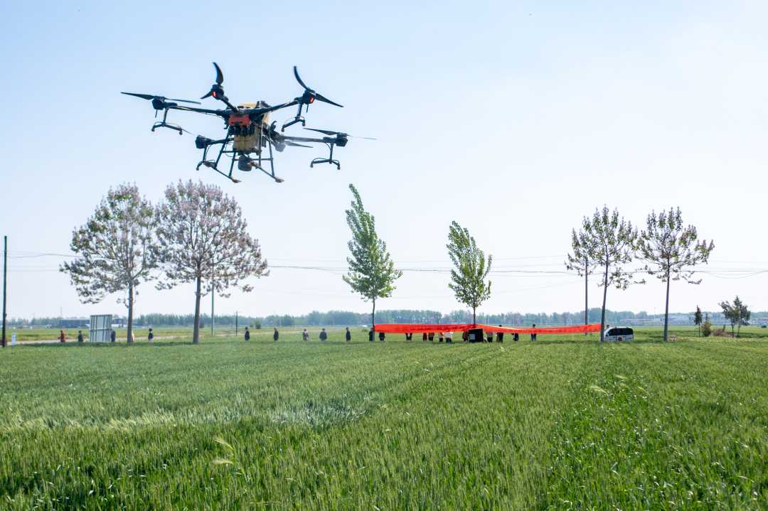 4月24日,河南省商丘市睢县尤吉屯乡东周楼村一处麦田,农技人员操控植保无人机开展小麦“一喷三防”作业。