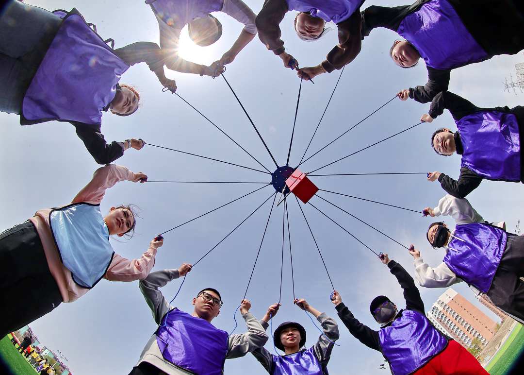 4月24日,河北省秦皇岛市海港区河东街道举办职工趣味运动会,图为运动员在体验趣味游戏“合力建塔”。