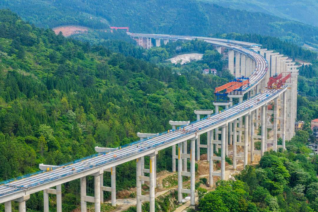 4月25日,湖南省永州市双牌县境内,工人在零(陵)道(县)高速建设工地进行桥梁施工作业。该项目是湖南省高速公路网永州—贺州高速公路的组成部分之一。项目建成后,将极大改善湘南山区交通状况。