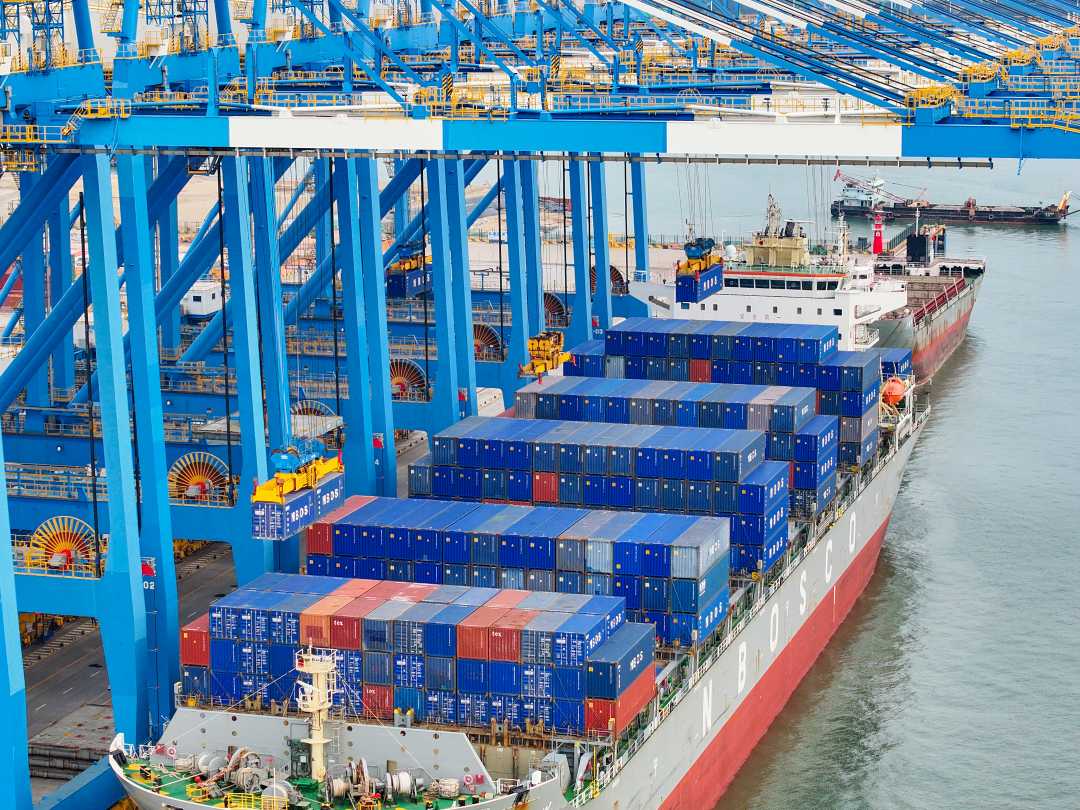 4月24日,货轮停靠在广西北部湾港,自动化集装箱码头正在进行卸船作业。
