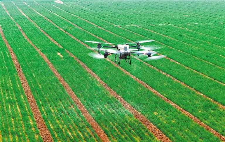 3月4日,河南省洛阳市缑氏镇夫子庙村,农户利用农业植保无人机对高标准农田里的小麦进行飞防作业。