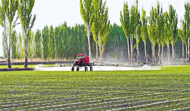 4月21日,新疆生产建设兵团第二师二十二团二连的高标准农田里,一台自走式喷杆喷雾机在辣椒田里进行植保作业。
