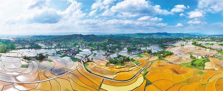 4月8日,重庆市梁平区双桂街道盐河村,已翻耕的稻田蓄水充足,平整如镜,与农房、道路、树木等相映成趣。