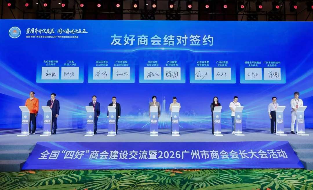 活动上,发布《中共广州市委社会工作部、广州市民政局、广州市工商业联合会培育行业协会商会若干措施》,从党建引领、改革攻坚、服务效能、等级评估、品牌打造、队伍建设、产业生态、社会治理八个方面为全市行业协会商会高质量发展提供政策支撑与路径指引;为第三批广州市工商联商会统战联络员颁发聘书;公布50家2025年广州“四好”商会建设优秀案例,以先进标杆引领商会建设提质增效;北京专精特新企业商会与广东省机器人协会、四川省科技装备业商会与广州市制造业协会等全国、广州10对友好商会现场结对签约,深化跨区域、跨行业协作,推动资源共享、抱团发展,为民营经济协同发展注入新活力。