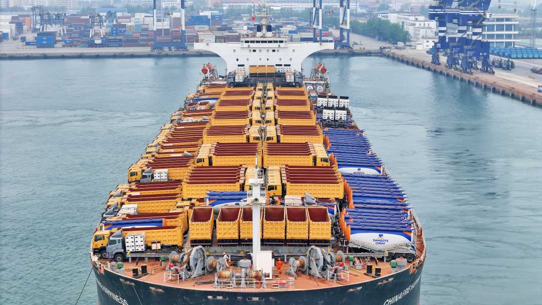 4月27日,一艘装载着520台国产工程车辆的中非班轮从山东港口烟台港起航驶往尼日利亚,刷新烟台港中非件杂货班轮航线单船装车量纪录。