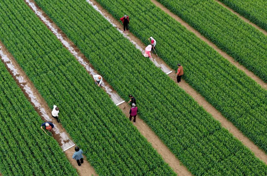 4月28日,安徽省亳州市农民抢抓农时,在麦套瓜地里加强农作物的间作套种和管护等工作,以提高种植效益,田间地头一派繁忙景象。