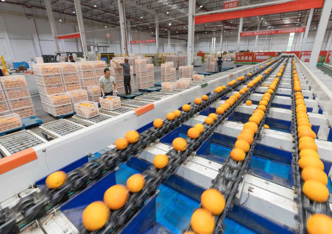 4月28日,湖北省秭归县脐橙物流园内,智能化分拣设备正在对脐橙进行筛选分级。